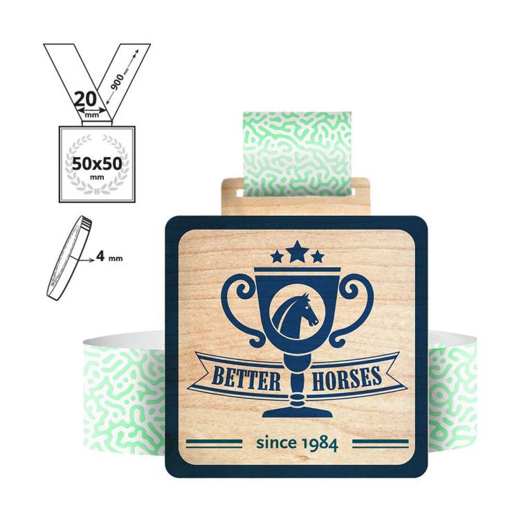 Medalla cuadrada impresa a todo color en el anverso, que incluye un cordón de 20x900 mm totalmente personalizable. Gracias al tratamiento especial -corte por láser e impresión UV a todo color en toda la superficie-, podemos realizar cualquier personalización requerida por el cliente.