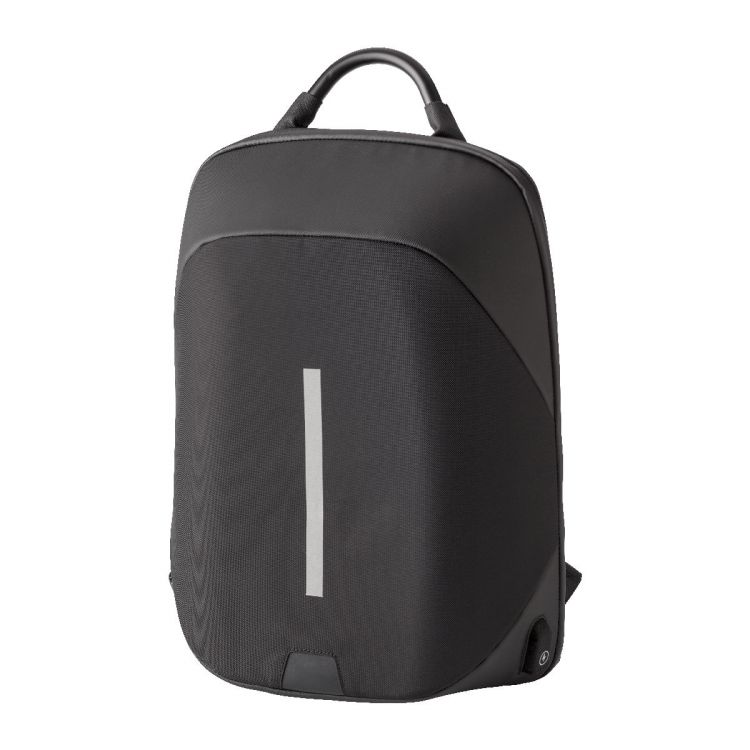 Mochila antirrobo de nailon (1200 D) con bolsillos interiores y un compartimento acolchado para portátiles de 15''. Espalda y tirantes ajustables acolchados. Candado, puerto y cable USB, tira reflectante y asa metálica. Pieza especial para repartir el peso.