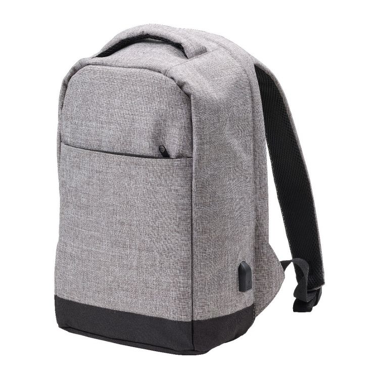 Mochila antirrobo de poliéster (600 D) bicolor, con parte trasera de PVC. Incluye un compartimento para el portátil de 13'', bolsillos interiores, uno con cremallera, un bolsillo externo con cremallera en la parte trasera y un puerto USB en el lateral.
