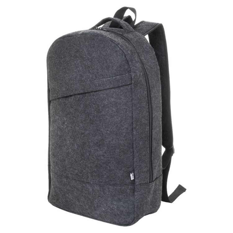 Mochila de fieltro RPET con compartimento principal con cremallera y bolsillo frontal. Con compartimento para portátil (15"), correa trolley y tirantes acolchados. Con etiqueta distintiva RPET.
