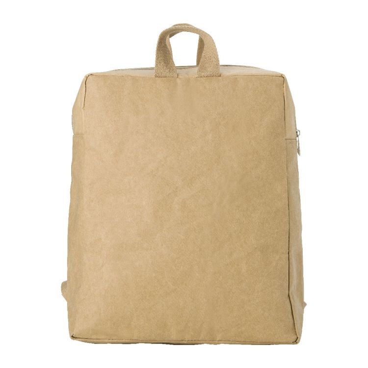 Mochila de papel laminado (310 gr/m²). Compartimento principal acolchado con varios bolsillos dentro y tirantes ajustables. Capacidad máxima de peso: 7 kg.