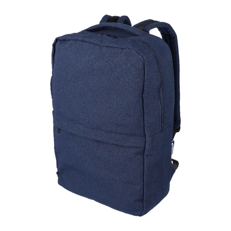 Mochila de polialgodón reciclado (330 g/m2) con forro de poliéster 210D. Cuenta con un amplio compartimento con cremallera, con un espacio acolchado para el portátil (15’’), dos compartimentos interiores y dos exteriores, uno lateral y un pequeño bolsillo frontal con cremallera. El diseño incluye tirantes acolchados ajustables y un asa de transporte. Capacidad: 14L. Capacidad de carga: 13 kg. Incluye una etiqueta indicando que es material reciclado.