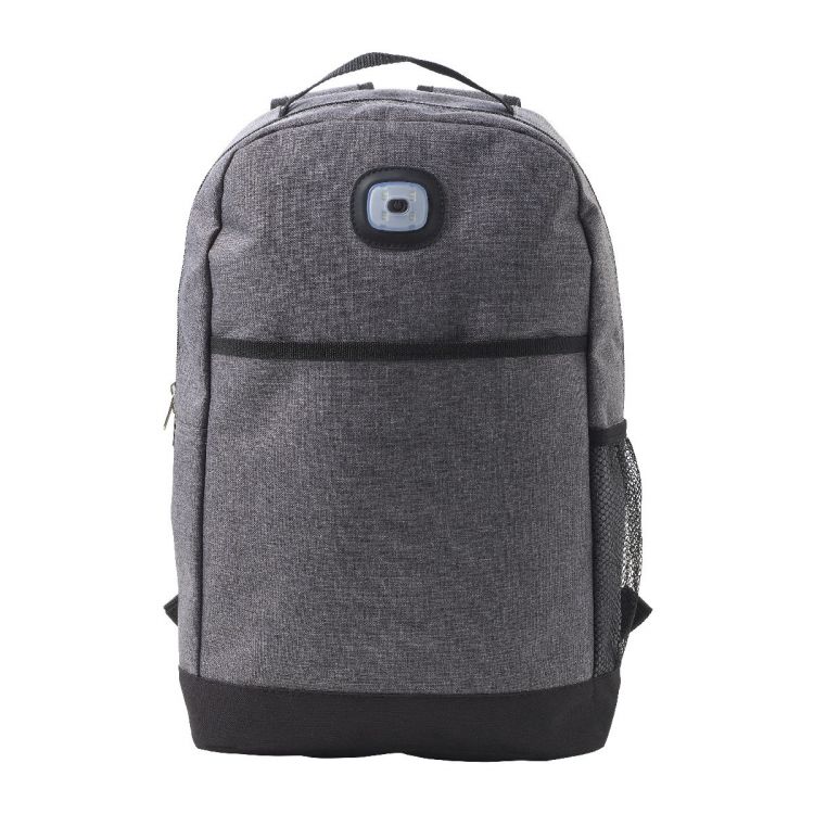 Mochila de poliéster (300 D + 210 D), con tirantes acolchados y ajustables y espalda también acolchada. Tiene un gran compartimento principal y un bolsillo frontal. Luz COB con dos ajustes: blanco y rojo. Incluye pilas.