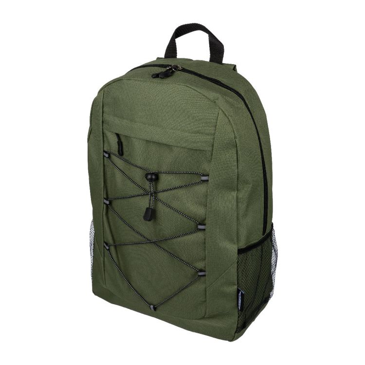 Mochila deportiva de poliéster rPET 600D con cierre de cordón y compartimento principal grande con cremallera. Cuenta con bolsillos laterales de malla, bandas delanteras elásticas para sujetar una manta o una cantimplora y un bolsillo delantero pequeño abierto con cremallera de decoración. Tiene cintas regulables y una etiqueta rPET.