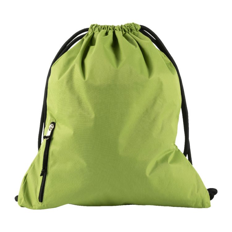 Mochila de gruesas cuerdas, de pongee (190 T) repelente al agua. Tiene un bolsillo frontal vertical, con cremallera.