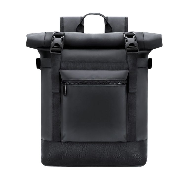 Mochila confeccionada en suave PVC con sistema de cierre enrollable y hebillas. Dispone de un bolsillo con cremallera. Interior de gran capacidad con compartimento acolchado para portátil de hasta 15 pulgadas y Tablet de 10”. Cintas laterales ajustables que permiten compactar el volumen según necesidad. Cintas de hombros en PU y espalda acolchadas para mayor comodidad. Incluye cinta trasera para ajuste en trolley o maleta, ideal para viajes y desplazamientos. (color negro)