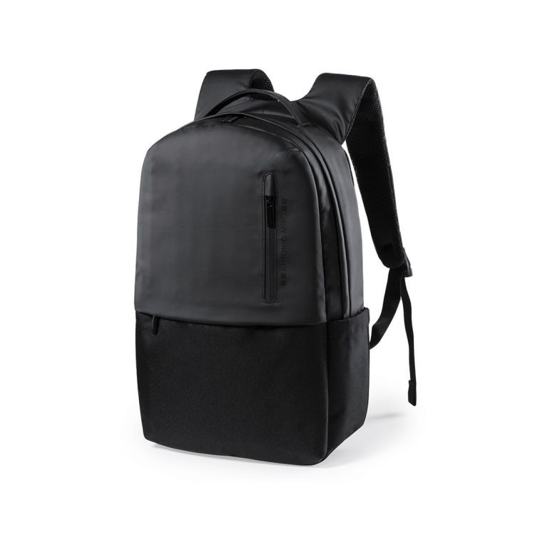 Mochila de Antonio Miró de calidad premium en resistente poliéster 600D de sobrio diseño en color negro. Con cierre de cremallera, bolsillo frontal y asa reforzada metálica. Con acolchado ergonómico en espalda y cintas de hombros, incluye compartimento interior acolchado para portátil de hasta 15 pulgadas y para tablets de hasta 10 pulgadas. Fundas interiores para bolígrafos y smartphone. Con logotipo de la marca en frontal. (color negro)