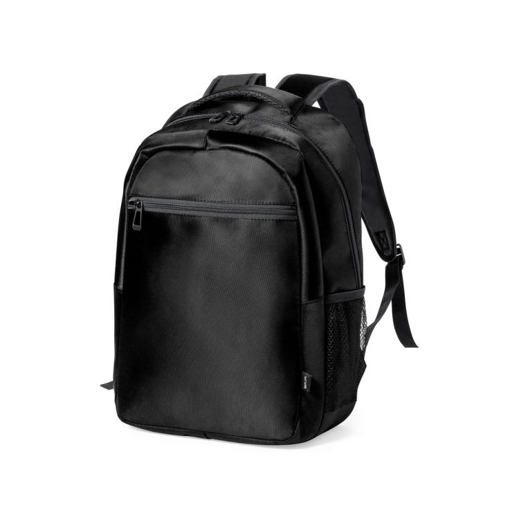 Mochila de alta calidad fabricada en RNYLON 420D. Compartimento principal con cierre de cremallera a juego y doble tirador. Incluye bolsillo exterior de cremallera y 2 bolsillos laterales de redecilla. Acolchado en asa, parte trasera y cintas para hombros, estas últimas ajustables. Interior con compartimento acolchado para ordenador portátil de hasta 15 pulgadas y accesorio en espalda para ajuste en trolley. Disponible en variada gama de colores, con distintivo reciclado en etiqueta exterior.El material RNYLON se elabora a partir de plástico reciclado, para así fomentar la reutilización de residuos plásticos y ayudar a la sostenibilidad del planeta.