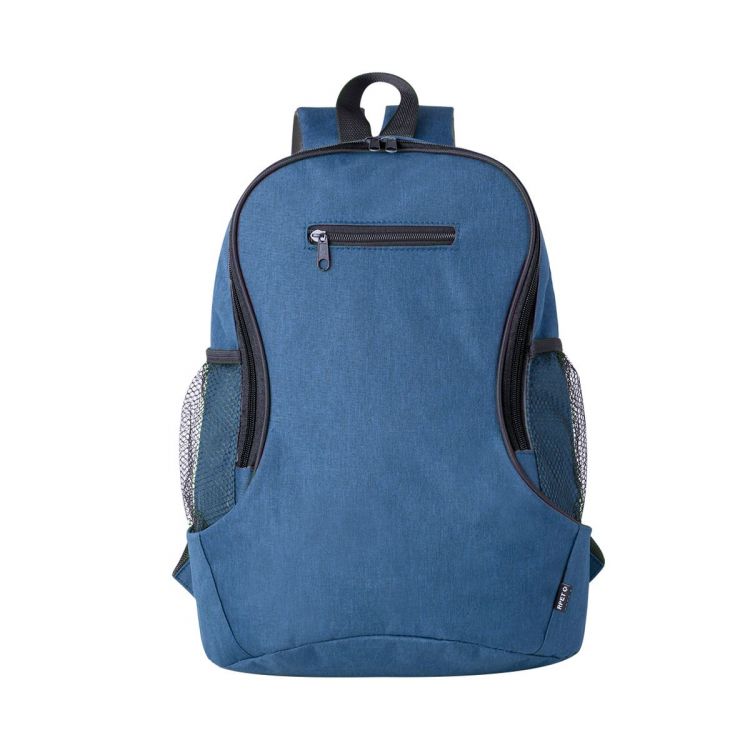 Mochila en resistente 300D RPET. Bolsillo principal y bolsillo frontal con cierre de cremallera. Cintas acolchadas ajustables para hombro y bolsillos de rejilla laterales. Logotipo RPET en etiqueta exterior. Disponible en variada gama de colores con accesorios en negro y embolsada individualmente en bolsa reciclada. El material RPET se elabora a partir de plástico reciclado, para así fomentar la reutilización de residuos plásticos y ayudar a la sostenibilidad del planeta.