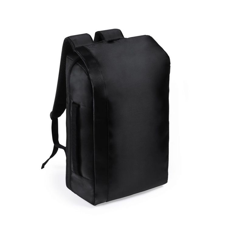 Elegante mochila fabricada en resistente poliéster con detalles en polipiel. Con gran solapa frontal y compartimento principal con cierre de cremallera de doble tirador. Interior con bolsillos acolchados para tablet de hasta 12 pulgadas y ordenador portátil de hasta 17 pulgadas. Asa de transporte lateral acolchada y accesorio de ajuste en trolley, con bolsillo antirrobo en parte trasera. Espalda y cintas de hombros acolchadas y ajustables. (color negro)