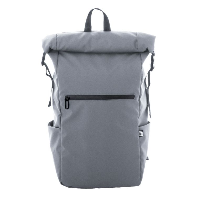 Mochila impermeable enrollable de RPET con cierre de hebilla y velcro, compartimento acolchado para portátil (16") y tableta (10"), bolsillo frontal con cremallera, bolsillos laterales, espalda y tirantes acolchados. Poliéster RPET 600D recubierto de PU, con etiqueta RPET distintiva.