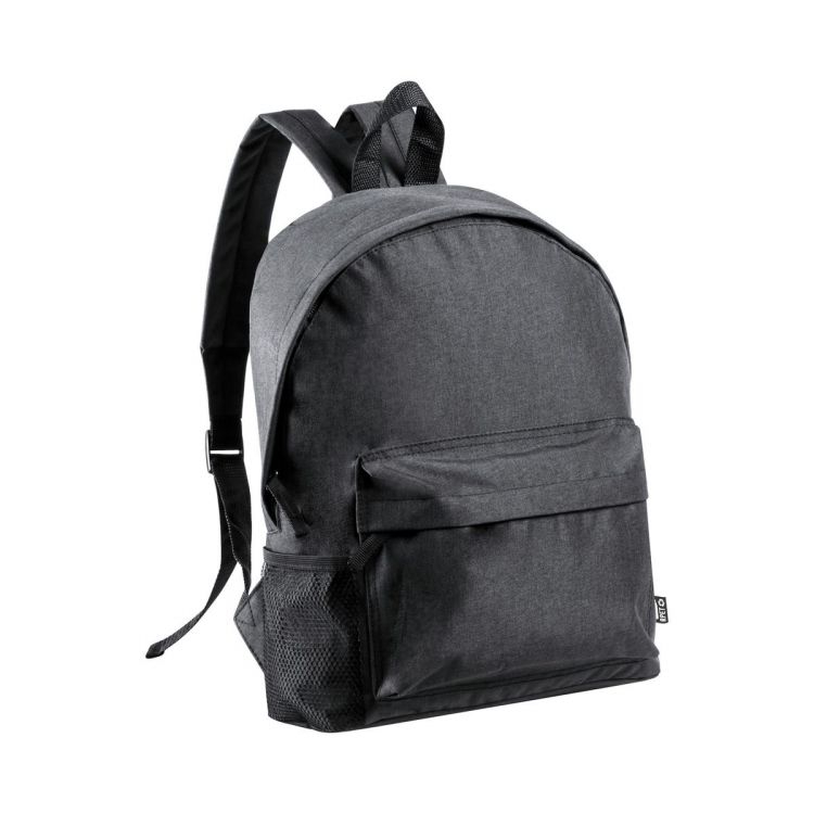 Mochila con bolsillo frontal con cremallera, bolsillo lateral de malla, espalda y tirantes acolchados. Poliéster RPET 600D. Con etiqueta distintiva RPET.