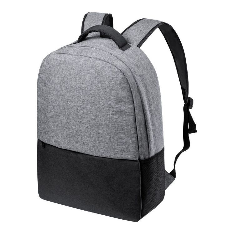 Mochila RPET bicolor con compartimento principal con cremallera, compartimento acolchado para portátil (15") y tableta (10"), bolsillos laterales, espalda y tirantes acolchados. Poliéster RPET 600D, de color gris