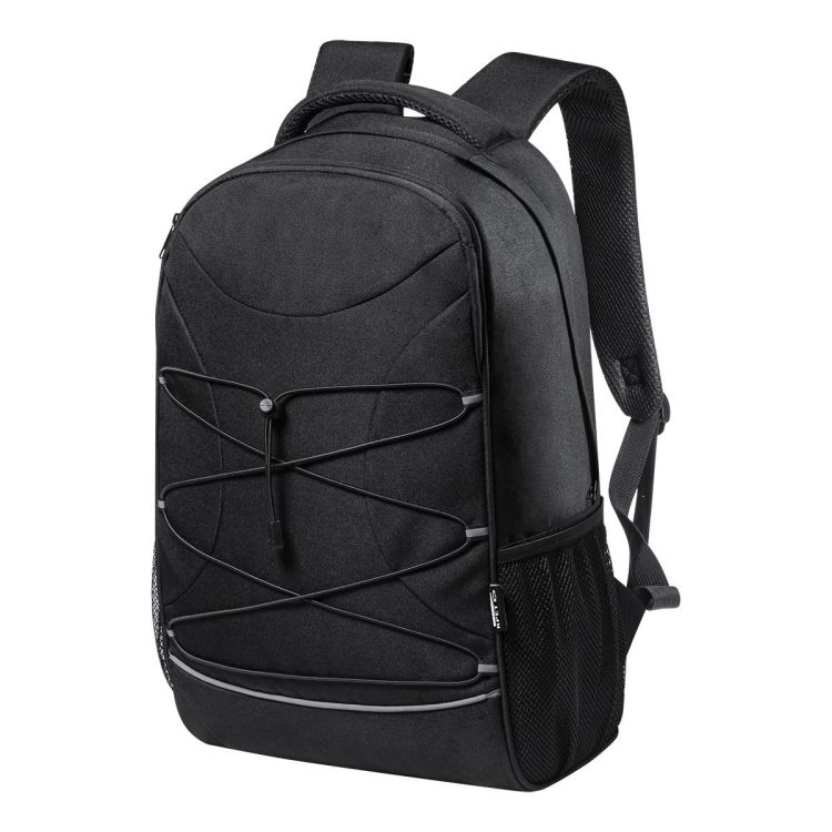Mochila RPET con compartimentos con cremallera, bolsillos laterales de malla, cordones elásticos en la parte delantera, compartimento acolchado para portátil (15") y tableta (12"), espalda y tirantes acolchados. Con etiqueta distintiva RPET. Poliéster RPET 600D, de color negro