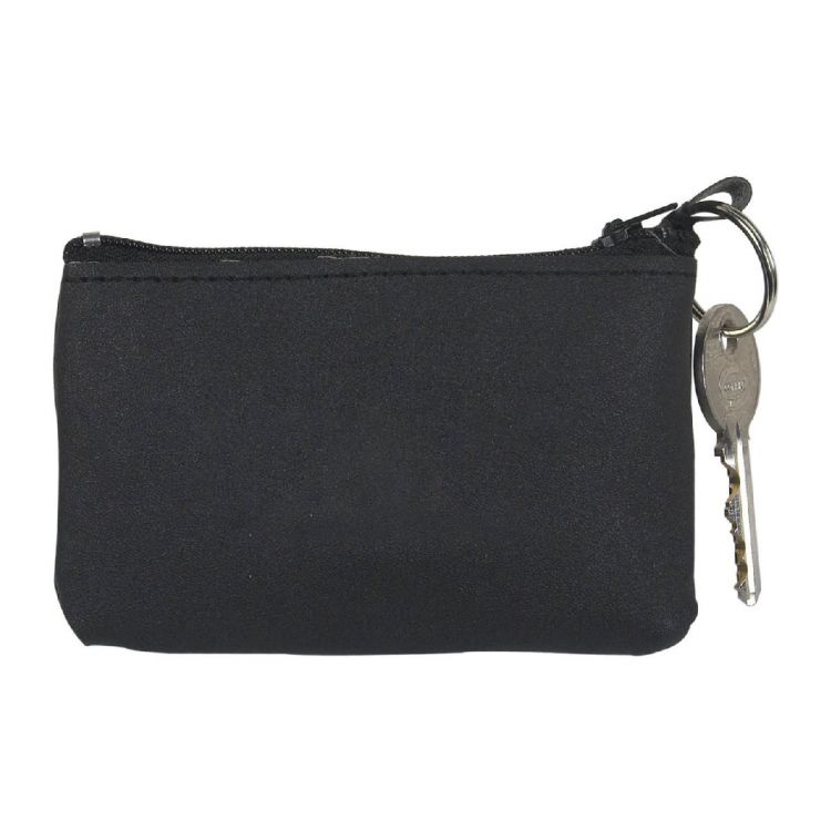 Monedero de imitación piel con un compartimento central cerrado con cremallera. Incorpora una anilla para usar como llavero.