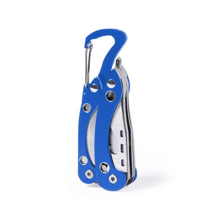 Multiherramienta de orizons con accesorios de acero inox de 6 funciones y mango de aluminio en vivos colores. Con alicates, navaja, abrelatas con destornillador de punta plana con función abrebotellas, destronillador de punta de estrella y mosquetón de acople. Presentada en atractiva caja de diseño con logotipo de la marca.