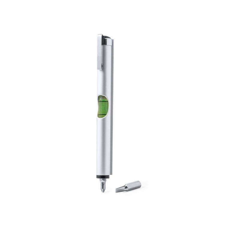 Práctica multiherramienta fabricada en aluminio, con nivel integrado en el cuerpo y dos cabezales para destornillador (plano y philips) en el interior. Con clip metálico de acabado cromado y presentada en caja de diseño kraft. (color natural)