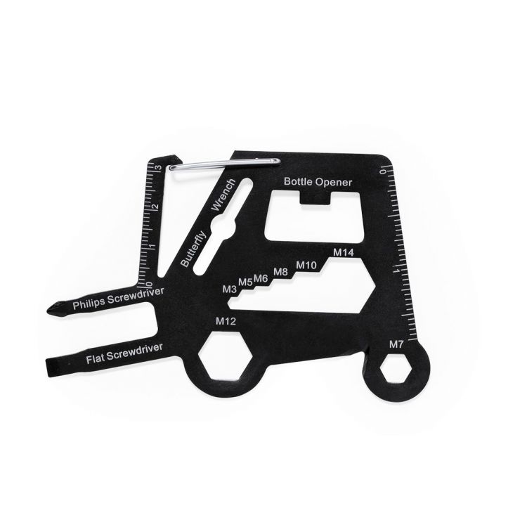 Original y práctica multiherramienta en acero inox con forma de toro mecánico. Con 16 funciones, entre otras: destornillador de punta plana y philips, llave para tuercas hexagonales en varios tamaños, regla, abridor de cajas y abrebotellas. Además de enganche en forma de mosquetón para un fácil transporte. Presentado en bolsa de papel reciclada. (color negro)