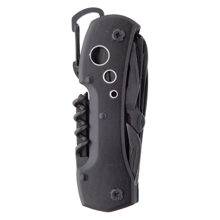 Navaja de bolsillo totalmente negra de acero inoxidable con 13 funciones, mosquetón y mango de aluminio, de color negro