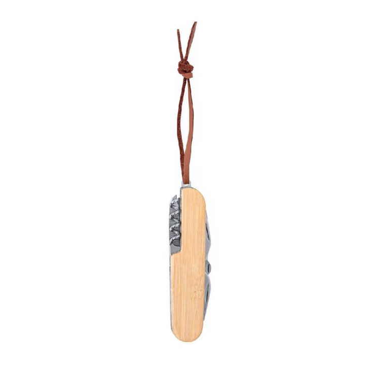 Navaja de bolsillo de acero inoxidable con mango de bambú y 9 funciones. Con correa de transporte de cuero PU