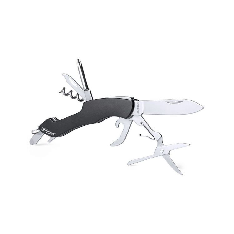 Navaja multiusos de orizons con accesorios de acero inox de 10 funciones y mango de aluminio en vivos colores. Con navaja, tijeras, abrelatas, abrebotellas con destornillador plano, destornillador de punta de estrella, punzón con lima y sacacorchos. Con anilla para llavero y presentada en atractiva caja de diseño con logotipo de la marca.