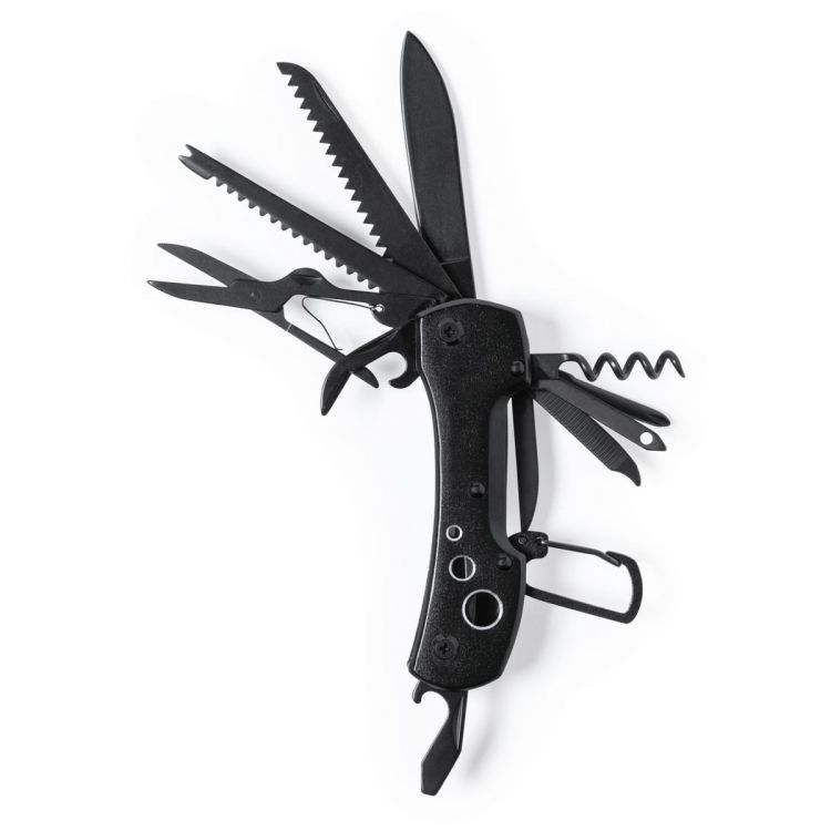 Navaja multiusos con accesorios en acero inox de acabado negro y resistente empuñadura a juego en aluminio, con mosquetón integrado en mango. 13 funciones, entre ellas cuchillo y navaja destornillador, lima abridor y tijeras. Plegable y de tamaño compacto, presentada en caja individual de diseño negra. (color negro)