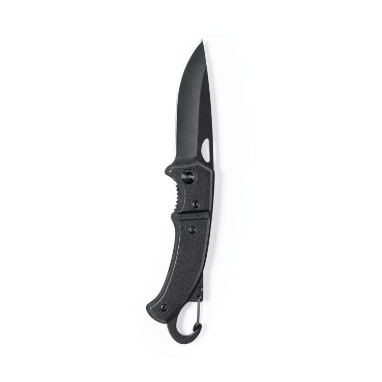 Navaja con hoja en acero inox de acabado negro y resistente empuñadura a juego en aluminio. Con mosquetón integrado en mango y bloqueo de seguridad. Con troquelado en hoja para una fácil apertura y presentada en caja individual de diseño negra. (color negro)