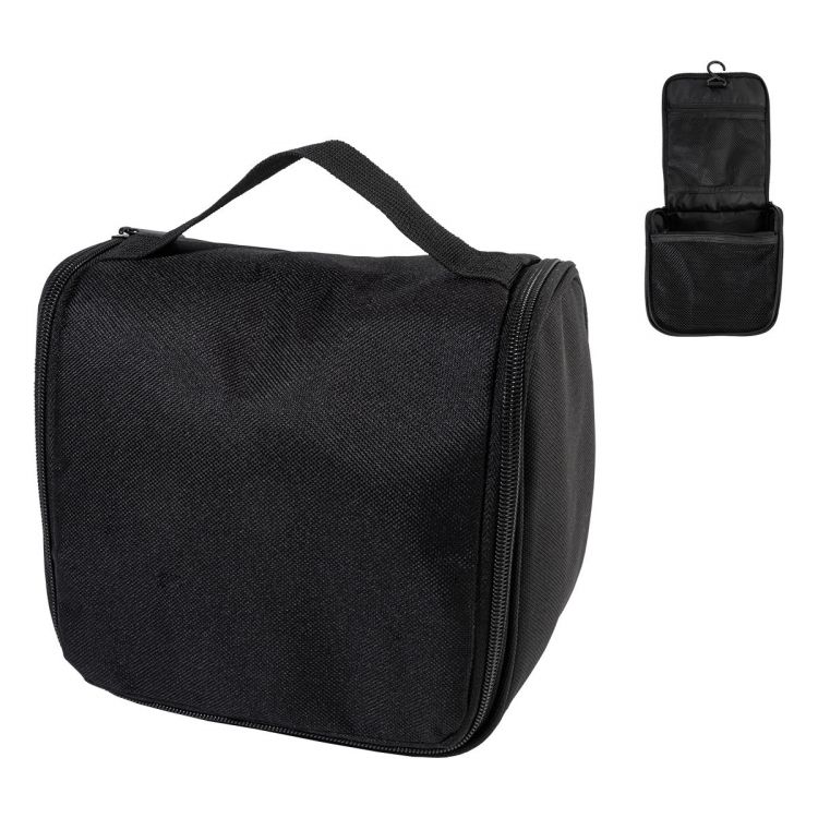 Neceser de poliéster 600D RPET con compartimentos interiores con cierre cremallera, bolsillos de malla y etiqueta RPET, de color negro
