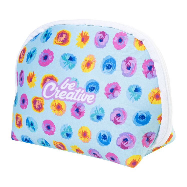 Neceser de neopreno RPET con cierre cremallera. Fabricado a medida e impreso por sublimación en toda la superficie. Incluye etiqueta RPET. Pedido mínimo: 50 unidades.