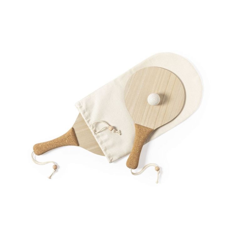 Par de palas de playa de línea nature. Fabricadas en madera, con mango reforzado en corcho natural y cintas para muñeca con ajustador. Presentadas en bolsa de algodón natural con cierre de cordón y pelota en caña de trigo. (color natural)
