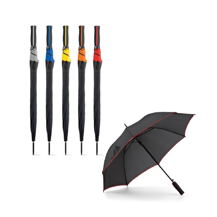 Paraguas de poliéster 190T con mango de EVA y mecanismo de apertura automática. Detalle de color a contraste en el paraguas y en el mango. ø1040 x 825 mm