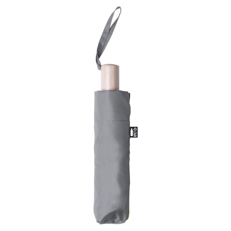 Paraguas plegable manual, resistente al viento, con 8 paneles en funda de color a juego. Con estructura metálica, varillas de fibra de vidrio y mango de madera. Pongee RPET 190T. Con etiqueta distintiva RPET.