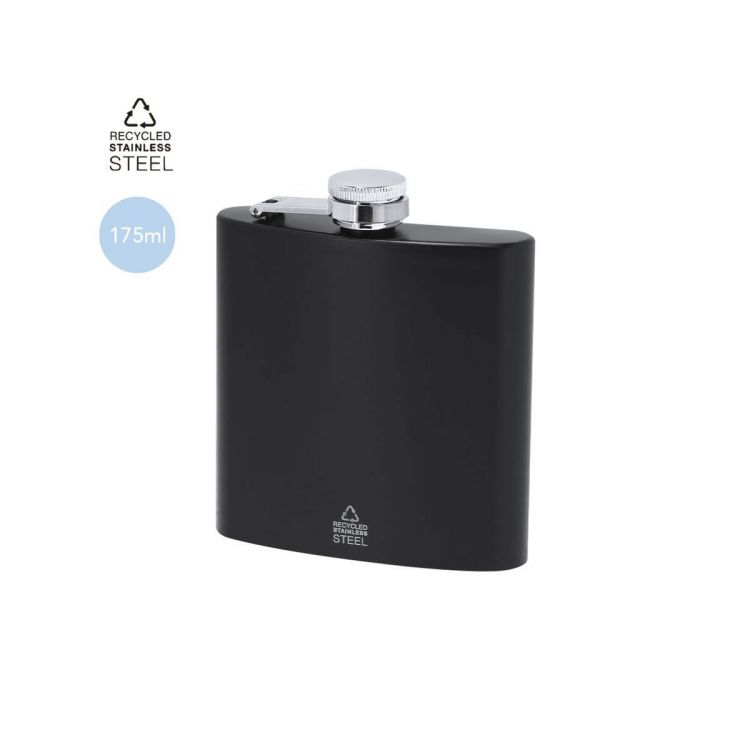 Petaca de 175 ml de capacidad con cuerpo de Acero Inox Reciclado y tapón de seguridad a rosca. De diseño ergonómico para guardar cómodamente en el bolsillo y cuerpo en acabado mate. Con distintivo de Acero Inox Reciclado.El acero es uno de los materiales más demandados y que puede encontrarse casi en todas partes, desde productos de uso diario a grandes construcciones. Con innumerables propiedades, entre las que cabe destacar la durabilidad y su alto grado de reutilización, convirtiéndolo en una alternativa muy valorada en soluciones de sostenibilidad. Debidamente tratado, permite obtener nuevos recursos de infinita utilización.