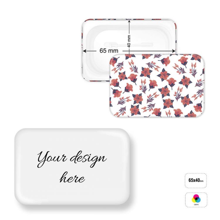 Placa de hojalata, totalmente personalizable. El producto ESTÁNDAR incluye el inserto de papel plastificado con impresión digital a todo color y el cierre clásico del distintivo de hojalata. Existen varios acabados opcionales: plata, oro, purpurina, relieve. También hay varias opciones disponibles para la parte posterior del distintivo, a elegir entre: pinza de cocodrilo, imán, cierre magnético.