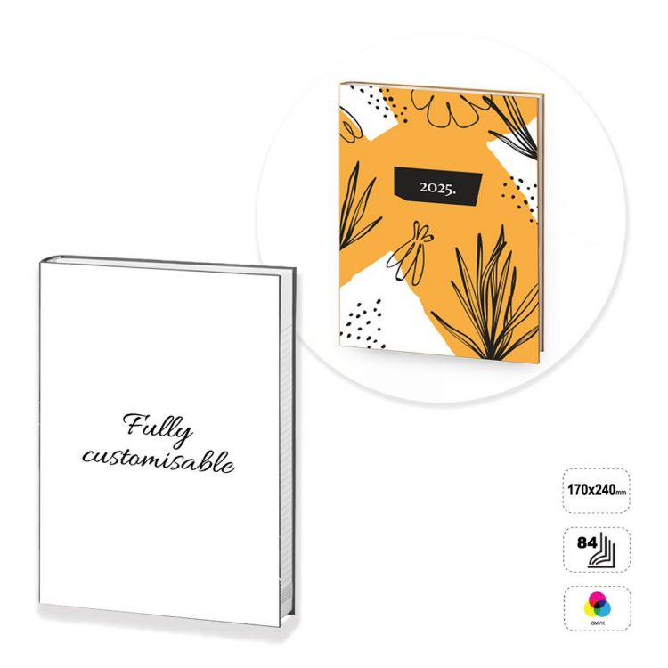Planificador semanal totalmente personalizable. El producto se compone de 84 páginas (incluida la cubierta) de papel 90 g, imprimible en 1 color (negro), y la cubierta de cartón 300 g con acabado brillante imprimible por el anverso o por el anverso y el reverso en cuatricromía. El acabado del anverso puede ser brillante, mate o soft touch. El producto está fabricado con un proceso especial para que la cola que mantiene las páginas unidas penetre más y el producto sea muy resistente. El planificador puede personalizarse modificando la plantilla prediseñada, o construirse completamente siguiendo las instrucciones en una plantilla neutra.