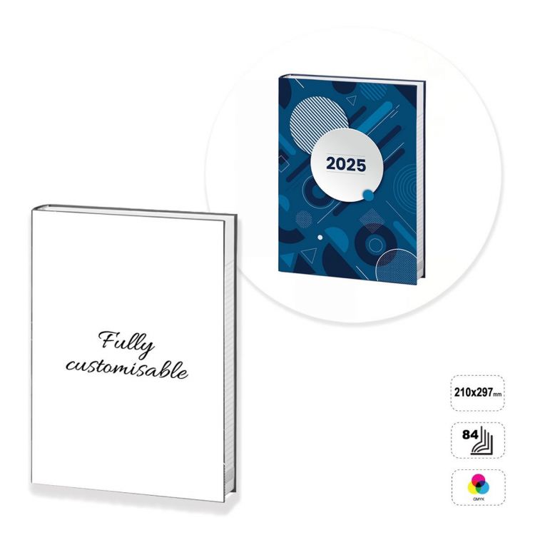 Planificador semanal totalmente personalizable. El producto se compone de 84 páginas (incluida la cubierta) de papel 90 g, imprimible en 1 color (negro), y la cubierta de cartón 300 g con acabado brillante imprimible por el anverso o por el anverso y el reverso en cuatricromía. El acabado del anverso puede ser brillante, mate o soft touch. El producto está fabricado con un proceso especial para que la cola que mantiene las páginas unidas penetre más y el producto sea muy resistente. El planificador puede personalizarse modificando la plantilla prediseñada, o construirse completamente siguiendo las instrucciones en una plantilla neutra.