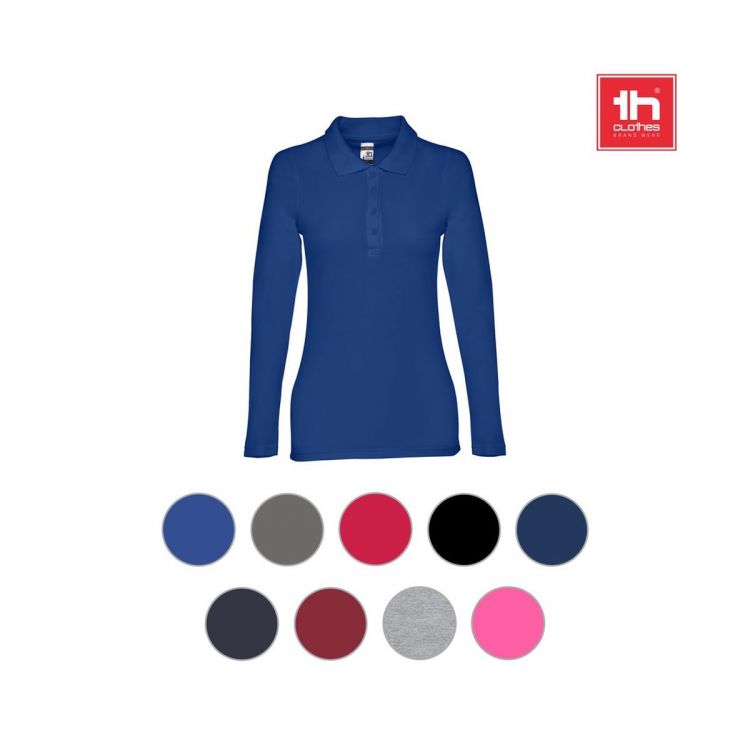 Polo de mujer de manga larga en piqué de algodón 100% (210 g/m²) (color 183: 85% algodón/15% viscosa). Cuello acanalado reforzado con cinta de piqué. Tiene la tapeta reforzada con 4 botones a juego con el color del polo (botón de repuesto insertado en la costura interior). Pieza cortada y cosida con mangas de doble costura. Tallas: S, M, L, XL, XXL