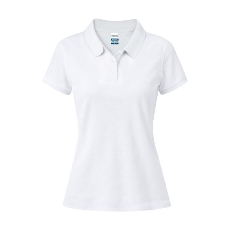 Polo de piqué para mujer en color blanco. En material 100% algodón de 220g/m2. Con dos botones de cierre a juego y aperturas laterales en los bajos. Tallas S, M, L, XL, XXL.