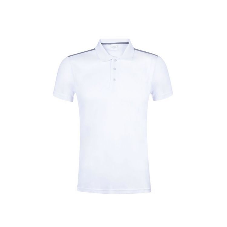 Polo técnico para adulto en poliéster transpirable de 180g/m2. De elegante diseño bicolor, en color blanco con contraste de detalles en gris. Disponible en tallas S, M, L, XL, XXL. Color blanco especialmente fabricado para marcaje en sublimación.