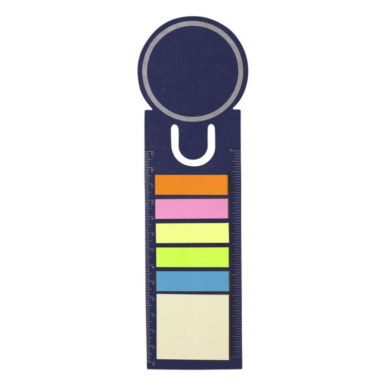 Marcapáginas de cartón con forma redondeada en el extremo superior. Con regla en ambos lados, 5 tiras adhesivas en varios colores y memo de 4 x 4,5 cm.