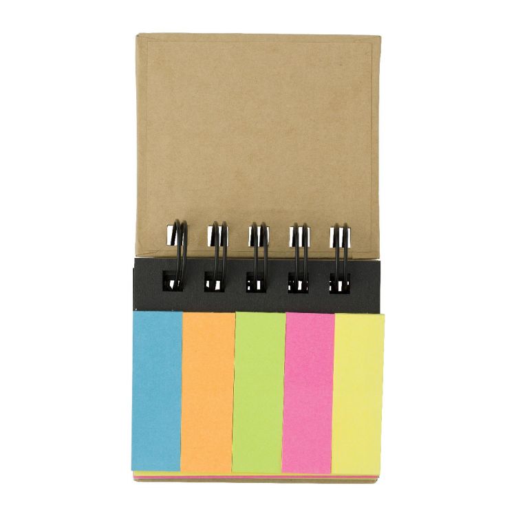 Bloc de notas de cartón con espiral. Tiene 100 memos adhesivos grandes y 125 más pequeños en diferentes colores.