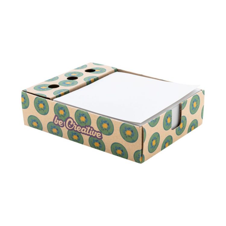 Portabolígrafos y dispensador de notas de papel kraft hecho a medida con bloc de notas de 300 hojas en papel reciclado (90×90 mm). El precio incluye impresión a todo color en el soporte. Cantidad mínima: 100 unidades