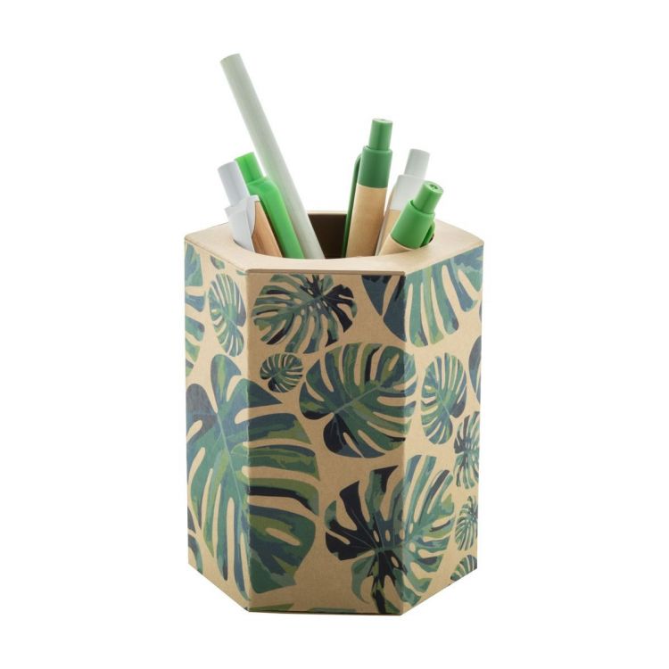 Portabolígrafos de papel kraft con forma hexagonal hecho a medida. El precio incluye impresión a todo color. Cantidad mínima: 100 unidades. Se entrega con embalaje plano