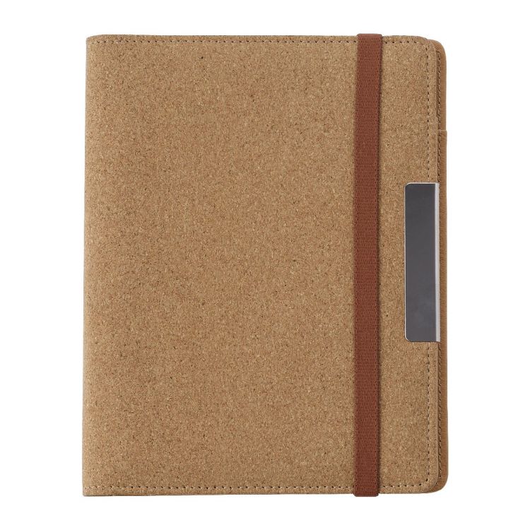 CarPETa de corcho (aprox. A5), con banda elástica como cierre. Interior en PU con pequeño bolsillo de malla como tarjetero, bolsillo grande, bloc de 20 hojas lineadas y porta bolígrafos elástico (no incluye bolígrafo).