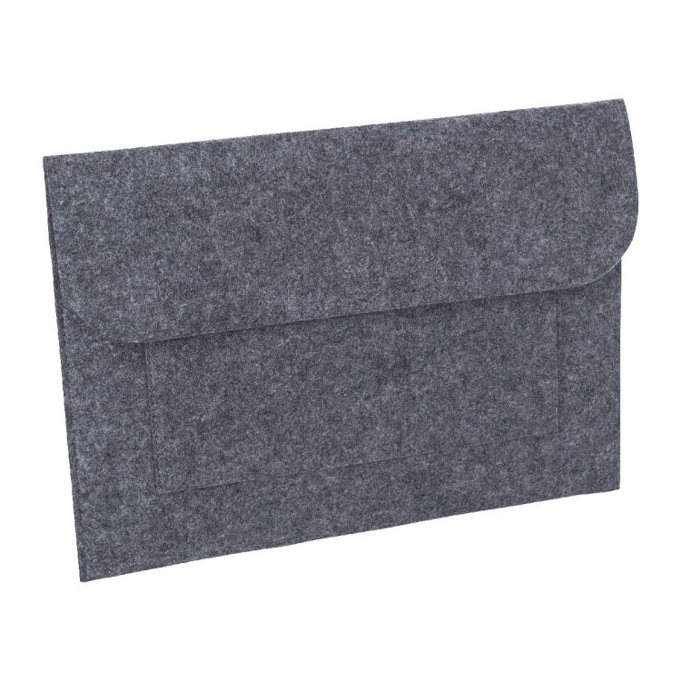 Portadocumentos de fieltro rPET con cierre de velcro. Un compartimento grande y un bolsillo delantero pequeño.