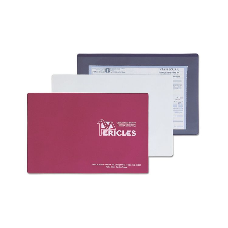 Sobre de póliza con una cara en polipiel y la otra en PVC transparente, apertura en el lado largo para insertar documentos.