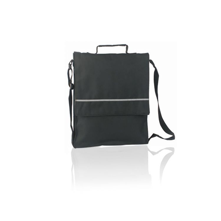Portadocumentos con solapa de cierre de velcro en poliéster 600D de vivos colores y con franja frontal reflectante. Con asas reforzada a juego, cinta bandolera ajustable y compartimentos interiores con fundas para bolígrafos y smartphone.