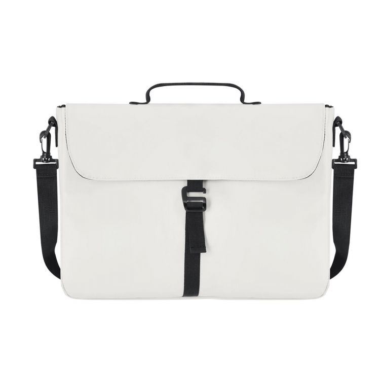 Portadocumentos de suave PU. Interior de gran capacidad con compartimento acolchado para portátiles de hasta 15 pulgadas. Con sistema de cierre de hebilla. Incluye cinta de transporte removible y acolchada. (color beige)