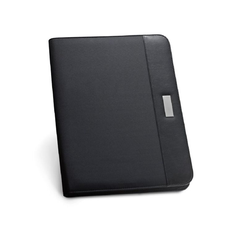 Carpeta A4 de PU y microfibra, con cierre de cremallera. La carpeta contiene con varios bolsillos interiores, bloc con 40 páginas rayadas (60 g/m²) y portalápices (no incluido). Placa disponible para personalizar. 245 x 325 x 40 mm | Placa: 16 x 45 mm. Producto en color negro