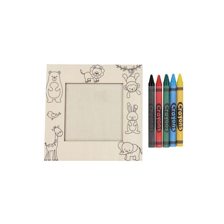 Marco de fotos fabricado en madera natural con diseño de animales. Incluye ceras de colores para personalizar y decorar el marco. Diseñado para fotografías de 7,5x7,5 cm. Cuenta con práctico soporte trasero de bisagra. (color natural)